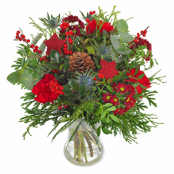 Vrolijk Kerstmis – een zoete boeket in de mooiste kerstkleuren. Dit boeket bevat bloemen zoals rode anjers, rode santini's en rode ilex, samengevoegd met dennenappels, rode glinsterende sterren, blauwe distels en eucalyptus, omringd door wintergroen. Dit boeket zal zeker een glimlach op het gezicht van de ontvanger toveren. Perfect voor een grote verrassing zonder het budget te overschrijden. Mooi bloemwerk met elke bloem zorgvuldig gekozen.