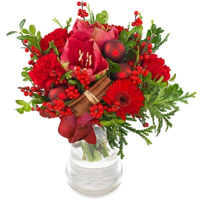Als je Kerstmis helemaal in rood wilt vieren, dan is dit het perfecte boeket. Rode amaryllis, rode germini's, rode anjers en andere rode bloemen... ja vandaag is rood, de kleur van Kerst!