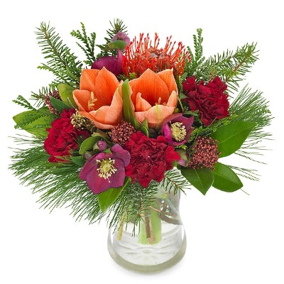 Dit warme feestelijke boeket in perzik, rode en paarse tinten is gemaakt met onder andere amaryllis en anjers en is een perfect cadeau voor de feestdagen. Je boeket wordt persoonlijk afgeleverd door een lokale bloemist.
