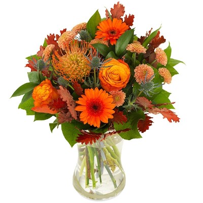 De rijke tinten van oranje zijn gevangen in dit boeket van oranje gerbera's, rozen en chrysanten. Zo warm en uitnodigend als een gezellige open haard op koude dagen.